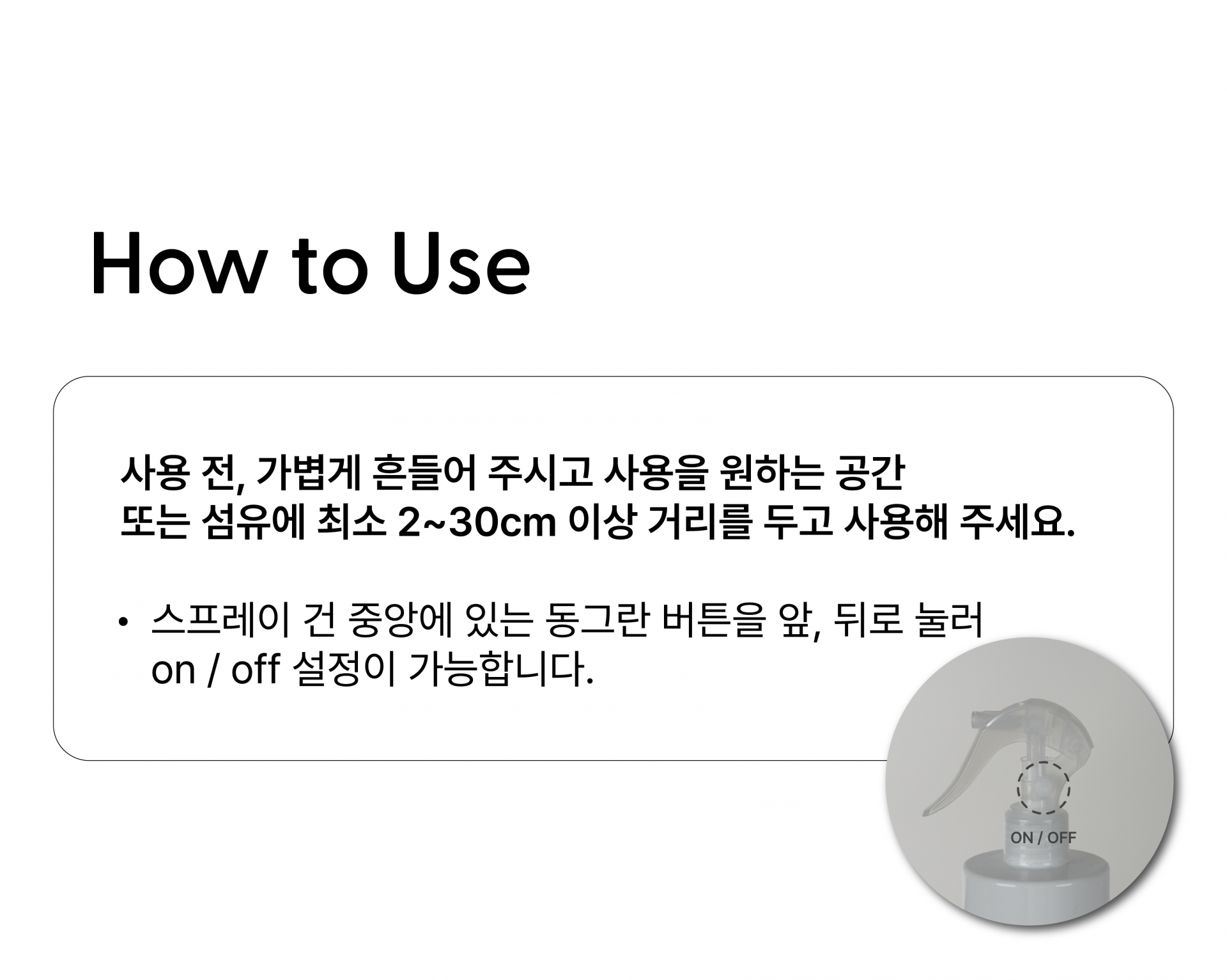 용도: 일반용(실내공간용, 섬유용, 가죽용, 실내용, 물체용), 자동차용(실내용) / 제형: 분사형-분무기형